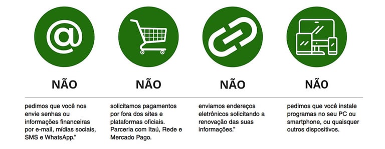 Não solicitamos o envio de dados pessoais, números de cartão ou senhas por esses meios. Dados financeiros podem ser requisitados por telefone somente em caso de reembolso da compra